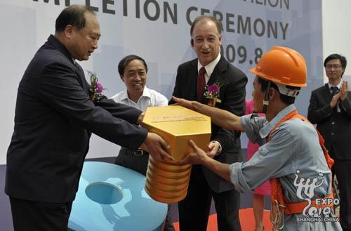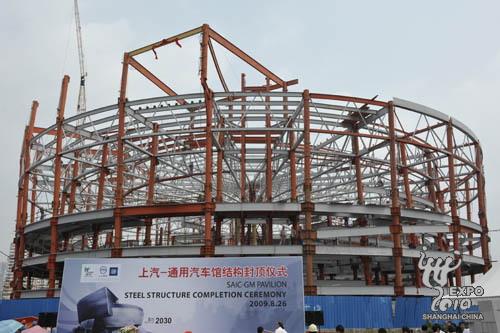 8月26日上午,2010年上海世博會上汽-通用汽車館鋼結(jié)構(gòu)正式封頂,標志性的螺旋型建筑外觀雛形初現(xiàn)。上海世博局黨委副書記許偉國、上海汽車副總裁肖國普、通用汽車中國公司總裁兼總經(jīng)理甘文維等出席封頂儀式,共同見證最后一顆螺釘釘入鋼梁。