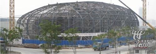 屋頂鋼結構基本組裝完成的上海世博會日本國家館