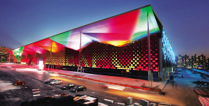 主題館的金屬色既不單調(diào),也不冷峻。整個(gè)建筑的明快線條和多變圖形,在金屬閃光中挾著一股現(xiàn)代暖風(fēng),迎面吹來。這個(gè)館堪稱世界級(jí)展館中的“巨無霸”:西廳2.5萬平方米,相當(dāng)于3個(gè)標(biāo)準(zhǔn)足球場;東廳兩層,各有1.7萬平方米;另外還有幾萬平方米的地下廳、中廳和下沉廣場。在世博會(huì)150年的歷史上,這是面積最大的一個(gè)展館。