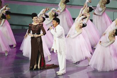 約半個小時的開幕式演出,聚合了五大洲的頂級明星,星光璀璨照耀浦江。在嘉賓入場后,由上海大學(xué)生組成的800人合唱團唱起一曲《和諧歡歌》,“鮮花簇?fù)砑s定地方,熟悉沒見過的臉龐,呼喚聽見心靈激蕩,邀世界分享……”著名歌唱家宋祖英和國際巨星成龍攜手出場,為本次世博會開幕唱響第一個強音。