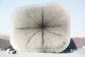 記者:我現(xiàn)在就在英國(guó)館外大概50米左右的地方,英國(guó)館占地6千平方米,是最大的自建館之一,在英國(guó)館的入口處外墻上印了這么一句話,“英國(guó)館就是英國(guó)送給中國(guó)的禮物”。為什么這么說(shuō)呢,因?yàn)檎挠?guó)館的外墻就像一個(gè)剛剛打開(kāi)的精致禮品包裝盒,種子圣殿就是禮物本身,在外面的露天廣場(chǎng)則是剛剛?cè)¢_(kāi)的包裝紙,游客們可以在上面休息,孩子們可以在上面嬉戲。