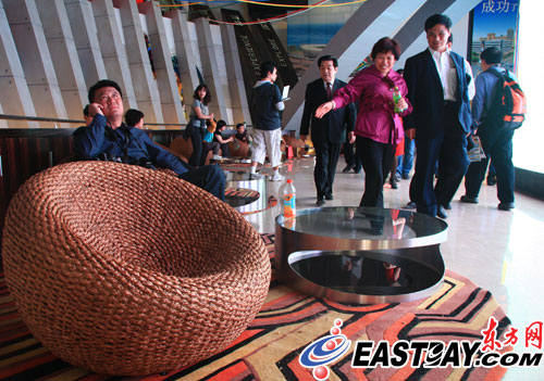 以“崛起的大國(guó)”為主題的南非館這次完全舍棄了野生動(dòng)物、美麗風(fēng)光等常態(tài)化展示,而是用一個(gè)球形的視頻墻占據(jù)在展館中央,四周圍放置著竹編的各式藤椅。負(fù)責(zé)籌建和部分設(shè)計(jì)的南非館的中方負(fù)責(zé)人黎先生告訴東方網(wǎng)記者,由于南非館將在世博會(huì)期間進(jìn)行五大主題的展示,“只有視頻能夠最好展現(xiàn)出來(lái)。”