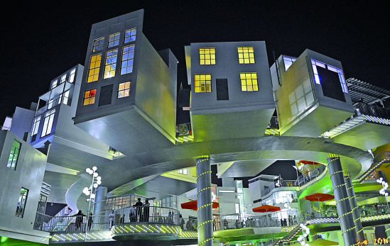 很多場館在設計時,就考慮了夜間效果,用燈光展示場館的另一面。浦東園區“燈光秀”的主打陣地是“一軸四館”。要欣賞夜景,首選地是世博文化中心:白天,它是潔白的巨型飛碟;夜晚,它變身神秘的“浮游都市”。