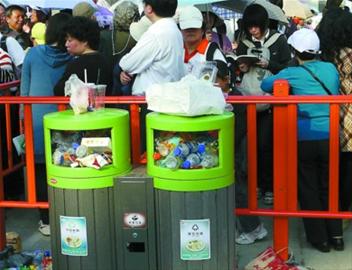在世博中心附近的一位志愿者說,行人們在丟棄垃圾的時候,一般對桶身上的提示標識不太在意,很少有人能分清“可回收物”、“其它垃圾”或“有毒垃圾”。為了體現環保、低碳理念,遍布園區的分類垃圾桶采用了特別“環保材料”。桶身上的一段文字向游人說明,材料由丟棄的牛奶紙盒、一次性快餐盒等經過粉碎高溫處理、壓制而成,節約了資源。“一個環保桶相當于節省了一棵成長五年的樹,減輕了原材料生產所消耗的能量。”