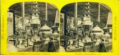 其中1862年倫敦世博會中國館立體照片,是迄今為止發(fā)現(xiàn)的世博會上有關(guān)中國館的最早的原版照片,彌足珍貴。照片由兩張一模一樣的正方形泛黃蛋白照組成。每張大小約在10厘米。底下一行英文小字顯示,照片由當(dāng)年的倫敦立體攝影公司制作完成。