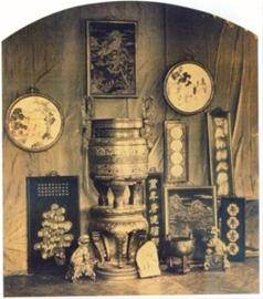 史料記載,1862年世博會上中國的參展規(guī)模很小,沒有單獨(dú)的展館,只是在主展廳內(nèi)有一個小小的展區(qū)展出一些陶瓷等中國土特產(chǎn)。照片印證了這一點(diǎn)。中國展示的有瓷器、佛像、琺瑯器、寶塔等,還有一張巨幅祖宗油畫。沒有獨(dú)立展館,但一個外國孩童正定睛觀看展品,初步顯示了東方藝術(shù)獨(dú)特魅力。