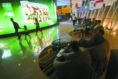 在館內,兩塊3D投影大屏幕已經就位,讓游客可以看到身臨其境的3D世界杯直播,其信號來自南非的電視臺。今晚,這塊屏幕會高清直播開幕式和首場比賽。而在“球吧”門口,便是世界杯倒計時碑,一分一秒地計算著距離世界杯到來還有多少時間。