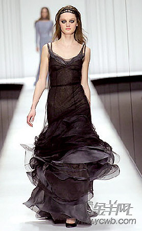 圓裙、小禮服是他的拿手好戲,Oliver最善于用他獨特的解構(gòu)主義方式,刻畫出瘦瘦的袖子、緊身的褲裝、平直的肩線和蓬大的裙子。06秋冬的Rochas照例設計深沉,強調(diào)黑與灰,有些壓抑,卻又讓人上癮,欲罷不能。模特們長發(fā)披肩,戴著黑色的發(fā)箍,畫著煙熏眼妝,層疊的輕紗帶出一種游離感,活脫是黑暗王子筆下的精靈。