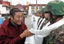 拉薩大昭寺僧人向武警官兵敬獻哈達
