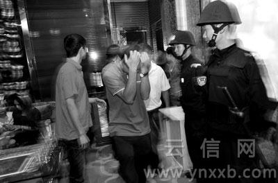 “緊急通知,今晚九點半在分局集中,參加統一行動!蓖21時左右,官渡公安分局治安大隊民警們突然接到了臨時通知。22時,內線發出信號,警車開往珥季路某娛樂會所。當50多名全副武裝的警察沖進該娛樂場所時,訓練有素的迎賓們并沒有慌亂,漂亮的姑娘們依舊招牌式笑著:“歡迎光臨”。