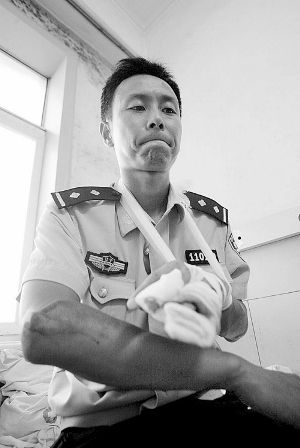 王梓的左手已經(jīng)被包扎上,紗布上面滲出很多鮮血。王梓的上肢到處都有很?chē)?yán)重的擦皮傷,警褲多處已經(jīng)撕裂。