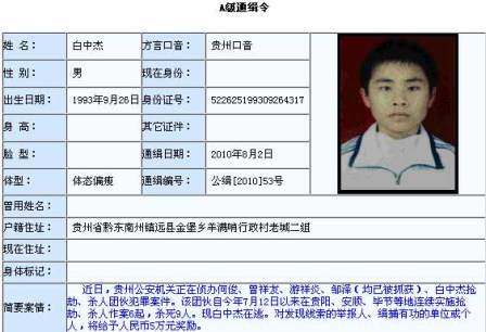 簡介:今年8月2日,公安部發(fā)布A級通緝令,懸賞5萬元緝拿在逃犯罪嫌疑人白中杰,他涉嫌參與一個搶劫、殺人團伙。該團伙自今年7月12日以來,在貴陽、安順、畢節(jié)等地連續(xù)實施搶劫、殺人作案6起,殺死9人。在公安部網站上自2006年1月26日以來公布的25個A級通緝令通緝的犯罪嫌疑人中,白中杰是年齡最小的,是唯一的“90后”。8月4日白中杰被警方抓獲。