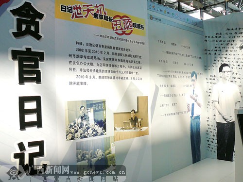 展廳中引人矚目的,是曾“名噪一時”的自治區煙草專賣局原銷售處處長、來賓市煙草專賣局原局長韓峰。“日記局長”也進入展覽,引來眾人圍觀。