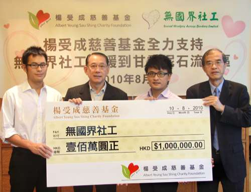 楊受成昨日以“楊受成慈善基金”名義,捐出一百萬港元予無國界社工。無國界社工將派出五名義工于本周五或以前到災(zāi)區(qū)視察災(zāi)情,并安排該一百萬元善款購買災(zāi)民目前最需要的物資,例如一般生活必需品等。首批物資最快可于本月二十日送到災(zāi)民手中。