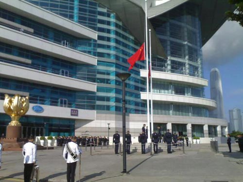 特區(qū)政府在灣仔金紫荊廣場舉行升旗及下半旗儀式,并為馬尼拉挾持人質事件中的死難者,默哀三分鐘。約500名市民參與儀式,部分人感觸落淚。