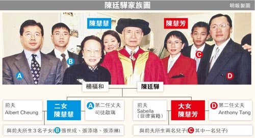 中新網11月25日電 據香港明報報道,香港第八大富豪、南豐集團主席陳廷驊家族爭產案,預計難以通過和平方式解決。據了解,雖然入稟控告次女陳慧慧的是陳廷驊的妻子楊福和,但案件其實也牽涉其它家族成員,特別是陳慧慧的胞姐陳慧芳。過去一直在美國生活的陳慧芳,最近兩年才返港,近日一直留守母親身邊。據悉,陳氏姐妹就家族財產的分配交惡,陳慧慧已經聯絡律師準備提出抗辯。