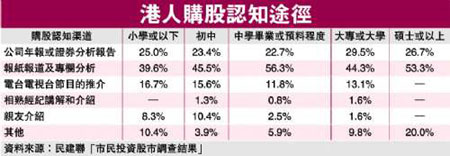 不過,即使在表示會初步了解公司資料者中,也有48.8%主要是透過“報紙報道及專欄分析”作為資料來源,13.1%則根據“電臺及電視節目推介”,只有24.7%的主要資料來源是“公司年報或證券行分析報告”。