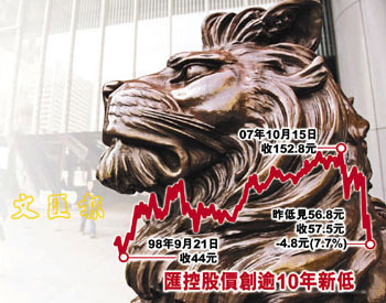 英國銀行股周一被洗倉,匯控急跌,跌勢持續至20日的港股,股價終跌穿60元大關,收報57.5元,跌7.7%,連跌7天后再創十年新低。恒指20日全日收報12959點,跌380點,跌幅2.9%,匯控已拖低恒指超過122點。
