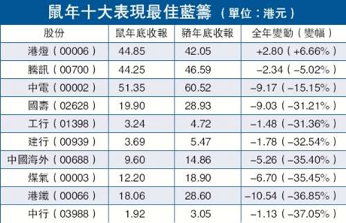大市重挫,恒指成分股亦不見得好過。在42只藍籌股中,只得港燈(00006)一只錄得升幅,全年計漲2.8元或6.66%;緊隨其后已為跌5.02%的鼠年藍籌新貴騰訊(00700),其余成分股大部分跌幅逾五成以上,富士康(02038)更跌近八成。