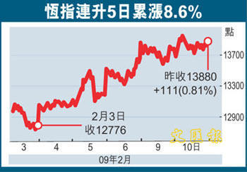 中新網(wǎng)2月11日電 據(jù)香港《文匯報》報道,港股連升5天,合計(jì)共升約1100點(diǎn),恒指10日收報13880點(diǎn),升111點(diǎn),成交421億。內(nèi)地傳出振興石化行業(yè)計(jì)劃,包括提高暴利稅起征點(diǎn),石油股上升,加上內(nèi)地股市升勢強(qiáng)勁,有證券界人士認(rèn)為市場在觀望美國通過救市方案后,恒指短期內(nèi)有機(jī)會上試14000點(diǎn)。