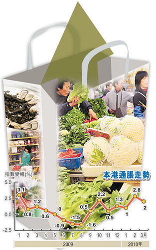 港府發(fā)言人預(yù)測,隨著經(jīng)濟(jì)復(fù)蘇,未來通脹壓力勢必增加。學(xué)者分析認(rèn)為,種種激化通脹的因素已經(jīng)逐漸浮現(xiàn),包括內(nèi)地旱情持續(xù)、人民幣升值、歐洲航班停航令歐洲產(chǎn)品供應(yīng)緊張等,預(yù)計(jì)香港通脹將加劇,今年內(nèi)或上升2%。