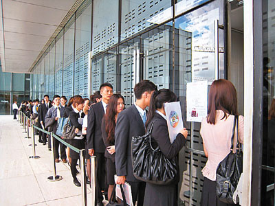 港龍舉辦的招聘會原定昨晨9時開始,但因8時前已有逾千人排隊等候,排頭位的應征者更于凌晨5時許抵達,港龍決定提早于8時開始派籌,1,200個面試籌于45分鐘內派完,應征者則分別獲安排昨日或今日面試及筆試。在8時45分抵達現場的陳小姐,到場后才知道面試名額已滿。她稱,未預料招聘反應如此踴躍,加上母親特別陪同到場打氣,對未獲面試機會感到無奈,認為港龍應臨場應變增加面試名額。