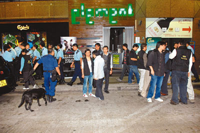 其間,有組織罪案及三合會調查科聯同反黑組及機動部隊共50多人,帶同一頭緝毒犬,于昨凌晨2時30分,掩至尖沙咀寶勒巷3號至7號萬事昌商場,逐一突擊搜查上址多間娛樂場所;另外又到赫德道一帶多間夜店進行查牌,并向可疑人士查閱身份證明文件,行動持續10小時。