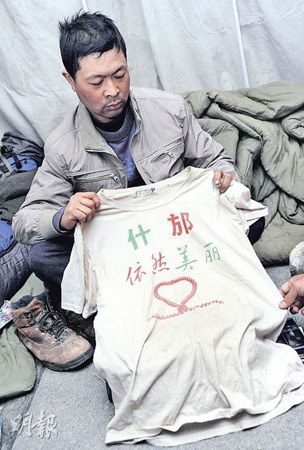 “眼看手勿動!”記者欲一睹黃福榮日記,男子立即阻止:“不行,我要將黃大哥的日記,親手交給他的家人!笔殖秩沼浀慕欣顦渲,是內地一家社福機構的救災義工,與阿福結緣于汶川地震,“我不單有黃大哥的日記,還有他在災區穿過的T恤”。