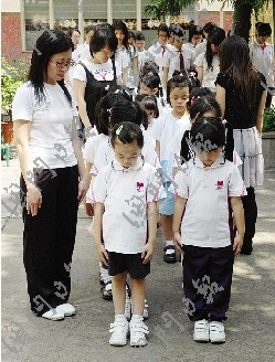 12日下午2時(shí)28分,圣心女子中學(xué)校長(zhǎng)蘇映璇引領(lǐng)全體師生默哀一分鐘,悼念去年汶川大地震死去的同胞,該校各級(jí)學(xué)生代表也在操場(chǎng)進(jìn)行獻(xiàn)花儀式。