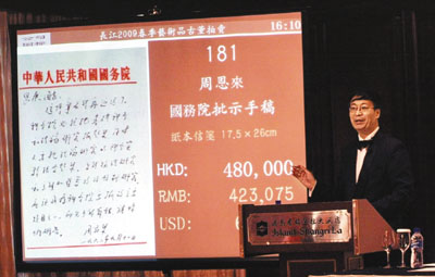 中新網(wǎng)5月25日電 據(jù)香港《文匯報(bào)》報(bào)道,長(zhǎng)江2009春季藝術(shù)品、古董拍賣會(huì)24日首次在香港展開,近400件珍品成功售出,總成交額高達(dá)1.3億元。拍賣品中包括珍貴的已故國(guó)務(wù)院總理周恩來(lái)親手批核的國(guó)務(wù)院批示手稿,24日以48萬(wàn)元高價(jià)成交。