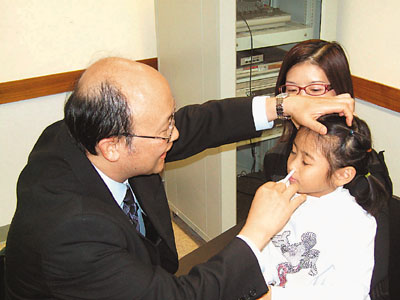 兒科專科醫生趙長成3日示范如何接種噴鼻式減活季節性流感疫苗。他指只需把疫苗噴入鼻腔即可,不但免卻打針之痛,也可避免打針后的紅腫副作用。(圖片來源:香港文匯報)