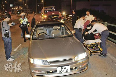 中新網(wǎng)1月22日電 據(jù)香港《明報(bào)》報(bào)道,香港三名猖狂惡煞,21日凌晨在灣仔行車天橋上高速飛車將仇家所駕私家車強(qiáng)行截停,用鐵錘敲爆車窗,遇襲司機(jī)慌亂倒車欲逃,卻撞及尾隨的士,無路可退下慘遭撲穿頭,血流滿面,車內(nèi)一個放有現(xiàn)金的手袋也被搶去,惡煞逃去無蹤。