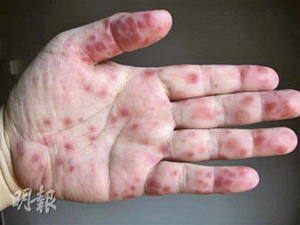 中新網5月27日電 據香港明報報道,香港手足口爆發疫情已敲起死亡警號,聯合醫院兒科病房一名女護士,本月12日疑被家中兩名女兒傳染腸病毒,雙手出紅疹仍繼續上班,直至上周五出現發燒暈眩才休假,周六昏迷送院,翌日死亡。由于死者4歲長女就讀的黃埔花園迦南幼兒園亦爆發手足口病,故衛生署建議該校今起停課7天。