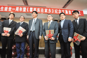 番禺區領導向霍英東家屬贈送《霍英東在家鄉》紀念文集。從左到右分別是:霍啟山、霍震霆、番禺區委書記譚應華、霍震宇、霍啟剛、霍啟人。