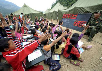 于是,災(zāi)區(qū)平地升起了帳篷放了桌椅、餐廳改建成課室、操場架起了活動板房,然后孩子就高高興興地上學(xué)去,努力地在這個非常時期爭取過一些正常的生活。莫說臨時學(xué)校環(huán)境差,那其實才是真正的“希望學(xué)!,是孩子心靈的暫寄之處。