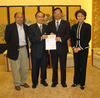 圖:晶苑集團主席羅樂風(左二)向中聯(lián)辦賑災專戶捐款港幣105萬元,中聯(lián)辦副主任鄭坤生(右二)代為接受。(圖片來源:大公報)