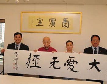 在這個(gè)“愛(ài)心書(shū)畫(huà)義賣區(qū)”內(nèi),最矚目的是國(guó)學(xué)大師饒宗頤教授親筆所寫(xiě)的“大愛(ài)無(wú)疆”,這四個(gè)大字已被香港潮屬總會(huì)名譽(yù)會(huì)長(zhǎng)高佩璇居士以500萬(wàn)港元義購(gòu),可謂一字百萬(wàn)金。在這里,最珍貴的不是這些字,也不是這筆捐款,而在于它帶來(lái)的情感上的震撼,一種骨肉相連、發(fā)自肺腑的真情。