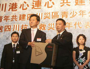 主禮嘉賓、中聯辦副主任李剛向18個重災縣青年志愿者組織贈送了抗震救災辦公設備,以協助災區重建。