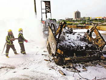 車禍發(fā)生后,私家車漏出電油,大巴上乘客紛紛逃命,其中一名大學(xué)生李啟文在睡夢(mèng)中被撞擊巨響驚醒,他立即救出壓在座椅下的女友,然后將她抱離車廂狂奔300米。私家車隨即冒煙爆炸,旅巴也繼而燃起大火,被困在廢鐵中的陳姓私家車司機(jī)慘被活活燒成焦炭,而大巴上也有8人受傷,其中一名重傷男子被救出時(shí)已證實(shí)不治。