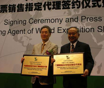 中新網(wǎng)3月3日電 據(jù)香港《大公報》報道,“中國2010年上海世博會門票銷售制定代理簽約儀式暨媒體見面會”2日下午在上海世博局舉行,此次簽約的13家銷售代理商,境內(nèi)代理商4家,境外代理商9家。香港中國旅行社成為首批簽約的上海世博會門票境外指定代理商之一,香港中旅總經(jīng)理周來衛(wèi)接受了上海世博局授牌。
