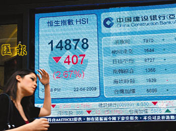 中新網(wǎng)4月23日電 據(jù)香港《文匯報(bào)》報(bào)道,港股經(jīng)周二轉(zhuǎn)勢(shì)后,22日繼續(xù)下跌,終跌破15000點(diǎn)。大市在上午曾一度上升,但午后內(nèi)地上證綜指急插水3%,拖累港股表現(xiàn),淡友趁勢(shì)發(fā)惡,午市大插400點(diǎn)的頹勢(shì),相信嚇怕不少散戶,尤其下午開市首15分鐘便挫近260點(diǎn)。恒指收?qǐng)?bào)14878點(diǎn),跌407點(diǎn),跌幅2.7%。