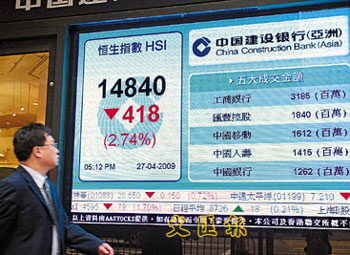 中新網(wǎng)4月28日電 據(jù)香港《文匯報(bào)》報(bào)道,雖然上周五美股上升,但在豬流感疫情擴(kuò)散的影響下,港股27日低開(kāi)98點(diǎn)后,加上工行外資股東限售股28日解禁,令內(nèi)銀股受壓,恒指隨后失守15000點(diǎn),收?qǐng)?bào)14840點(diǎn),跌418點(diǎn)或2.74%,國(guó)企指數(shù)跌337點(diǎn),報(bào)8641點(diǎn),大市成交530億元。