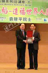 中新網(wǎng)12月3日電 被譽(yù)為“雜交水稻之父”的中國(guó)工程院院士、美國(guó)科學(xué)院外籍院士袁隆平日前在澳門科技大學(xué)D座會(huì)議廳作題為《發(fā)展雜交水稻、造福世界人民》的講座。許敖敖校長(zhǎng)代表澳門科技大學(xué)全體師生向袁隆平致以由衷的感謝,并向他頒授榮譽(yù)敎授聘書。