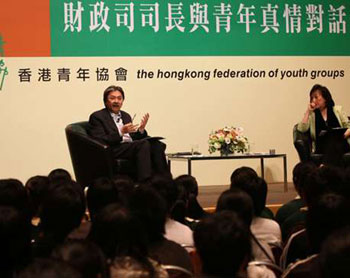 曾俊華在見面會開始之初就明確表示,歡迎學(xué)生發(fā)問任何問題,鼓勵他們切勿過分緊張。“你們有任何想法,或者你們知道親戚朋友有什么看法,都盡管提出來。如果你們覺得預(yù)算案是稍為沉悶的話,你們可以提出其它比較有趣的話題。”