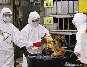 六月十一日,香港食環署人員穿著保護袍服到街市圍封活家禽零售點。漁護署當天宣布由于在深水埗等四個街市的雞只樣本,化驗出H5N1病毒呈陽性反應,因此決定于全港街市屠殺活家禽。漁護署表示,病毒源頭不排除是走私雞。 中新社發 譚達明 攝