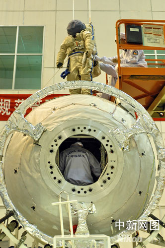 中國神舟七號載人航天飛船發(fā)射在即。圖為飛船在進行測試。袁明月 攝