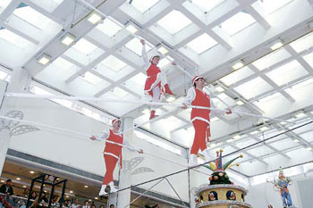 25歲的Jasmine是Peter的女兒,昨天她表演在鋼在線推手推車(chē),走過(guò)10多米的距離。樣貌標(biāo)致的Jasmine,一面手執(zhí)平衡桿,面帶笑容走過(guò)腳下的幼絲,臺(tái)下的觀眾卻為她“一步一驚心”。Jasmine說(shuō),她曾試過(guò)離開(kāi)表演事業(yè),在外另覓工作,但始終心系腳下這條鋼線。“始終一家人 能一起工作,獲得安全感和快樂(lè),是外面找不到的,而且我熱愛(ài)演出。”(周淑蘭)