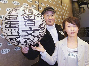 劉健威(左)與麥家碧捧著寫滿曾灶財墨寶的紙燈籠。(圖片來源:香港明報)