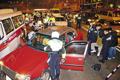 中新網1月25日電 香港一名司機涉嫌以偷來的士做無本生意多時,24日晚在銅鑼灣因沖紅燈惹起交警注意后逃走,結果掀起一幕由港島追到九龍全長22公里的警匪飛車追逐戰,賊的士后于東隧九龍出口收費廣場撞毀一部電單車及一部警車后始停下,亡命司機當場束手就擒,但共有7名警民受傷送院,包括的士司機。