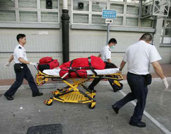 警員趕至制服裸婦,交由救護員綁在擔架床上送院檢驗。